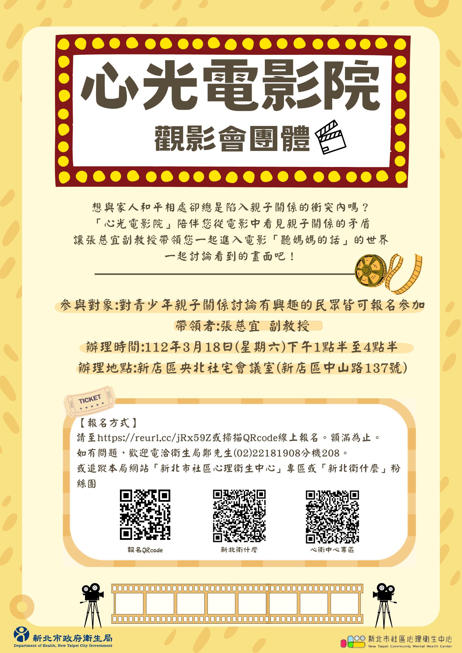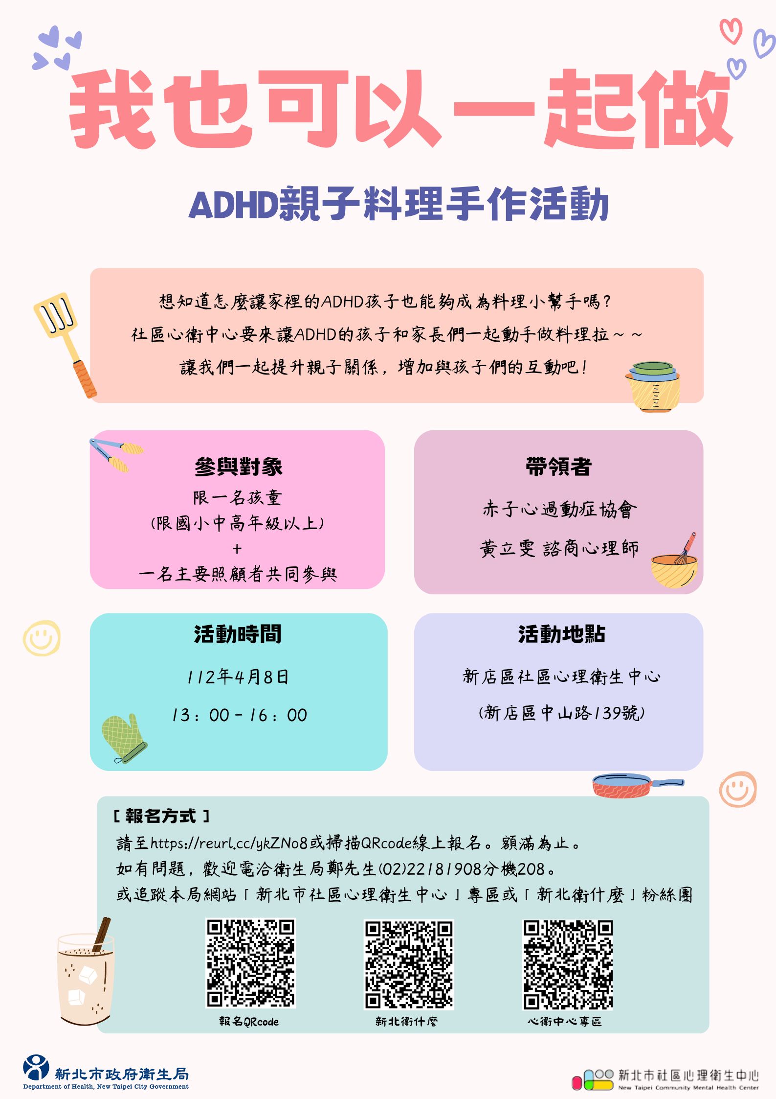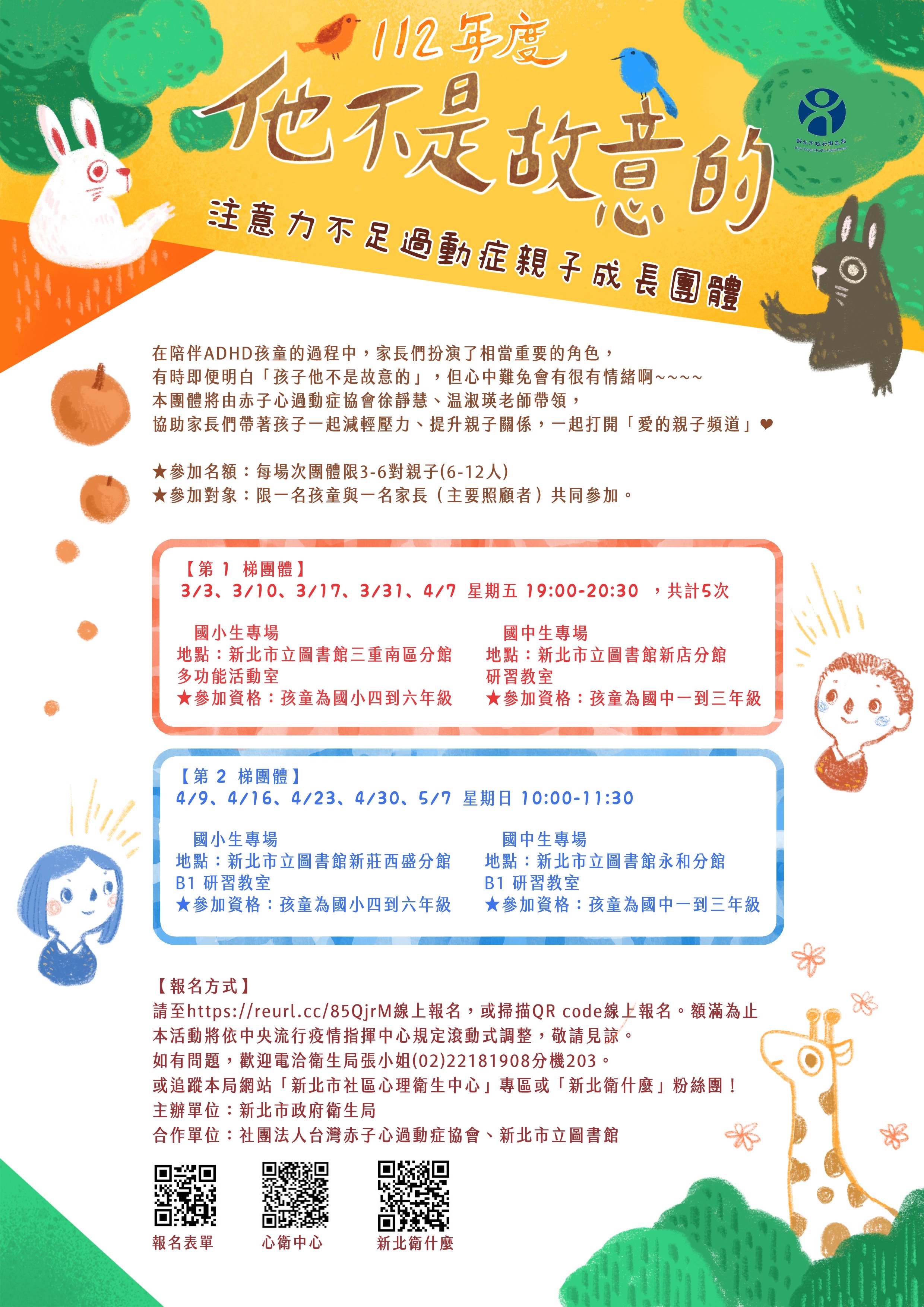 【轉知】新北市政府衛生局辦理112年度注意力不足過動症及青少年心理健康促進活動資訊,請鼓勵親師生報名參加