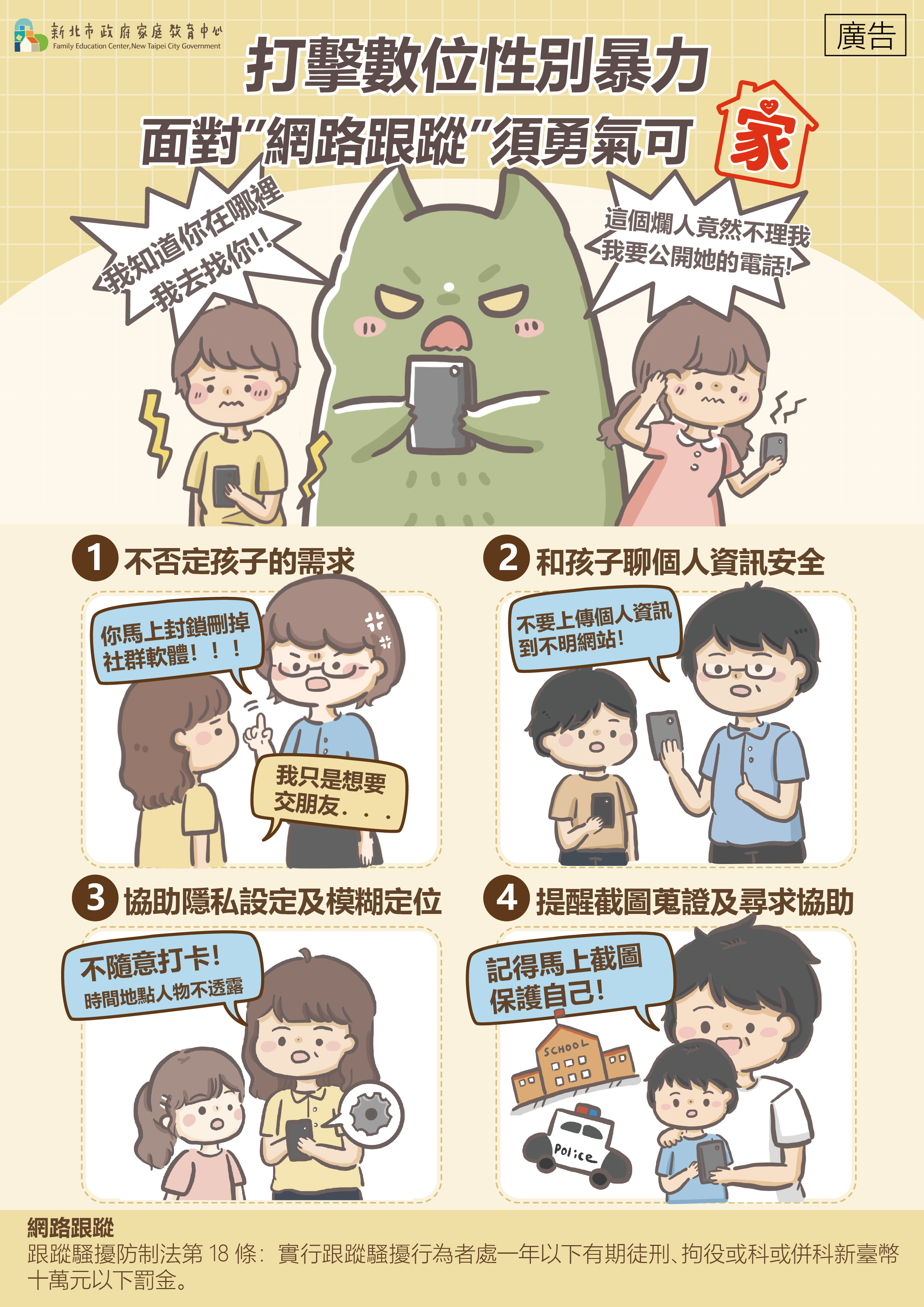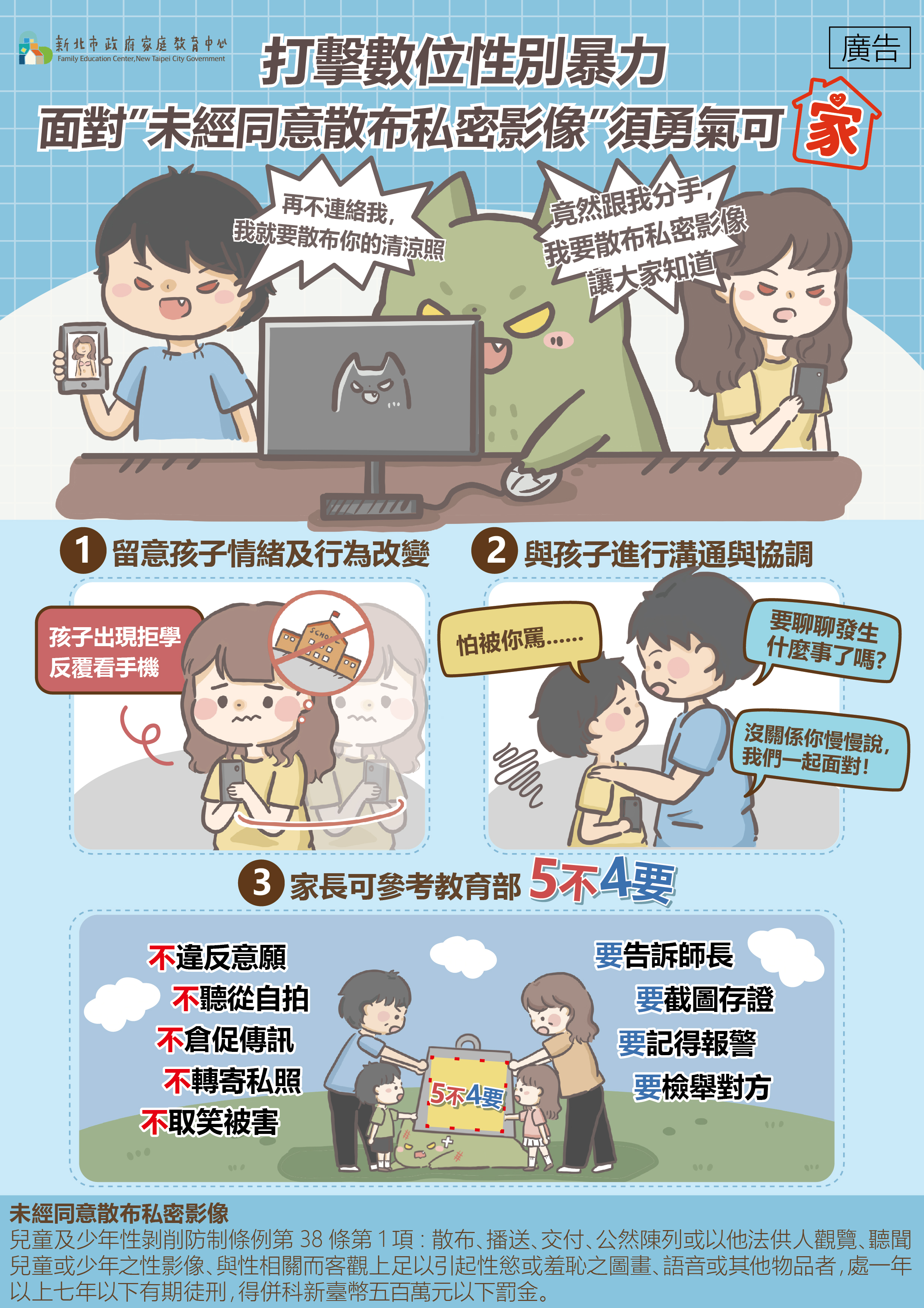 為增進國人防治數位性別暴力意識,鼓勵家長陪伴孩子面對數位性別暴力,提供理解與幫助,並結合校園、家庭與社會力量,共同打造安全的網路環境,鼓勵分享宣導圖