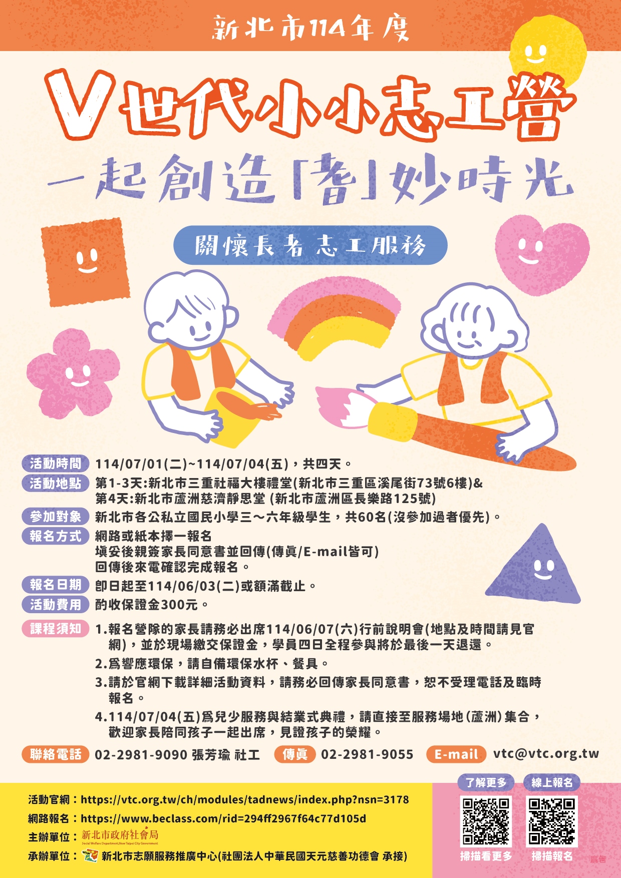 五、相關活動資訊及報名表、家長同意書請至新北市志願服務推廣中心網站(https://vtc.org.tw/ch/index.php)查看下載,如有聯繫事宜,請洽新北市志願服務推廣中心張芳瑜社工,電話:(02)29819090;傳真:(02)29819055;Email:vtc@vtc.org.tw。