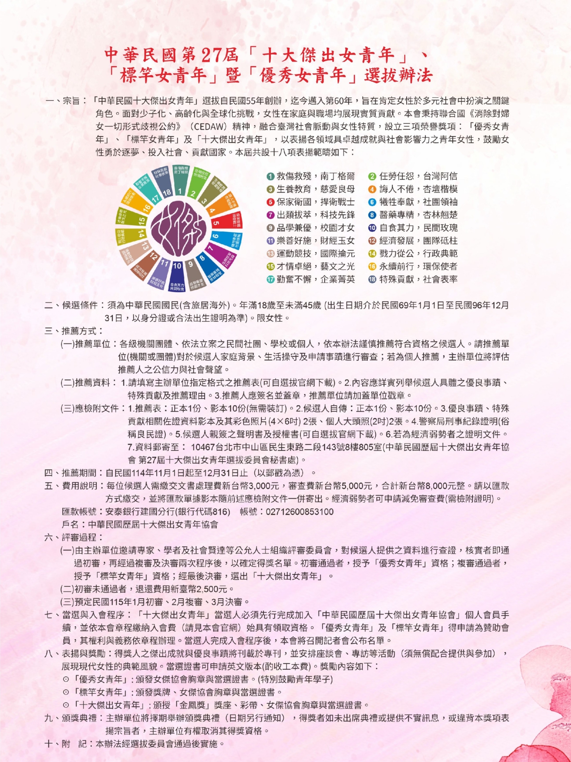 【轉知】社團法人中華民國歷屆十大傑出女青年協會舉辦第27屆「十大傑出女青年」、 「標竿女青年」暨「優秀女青年」選拔活動。