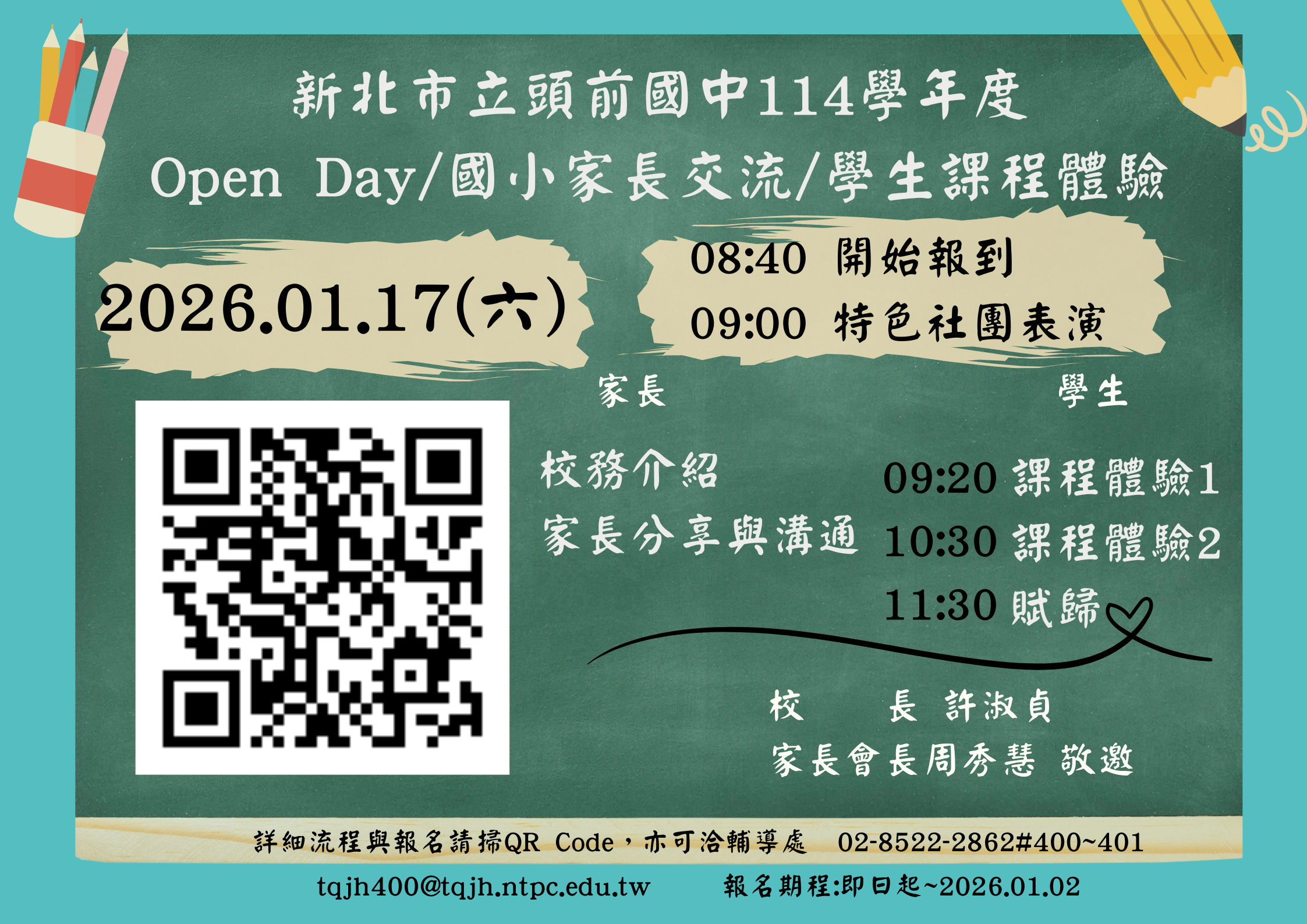 轉知:頭前國中114學年度「Open Day/國小家長交流/學生課程體驗」活動訊息